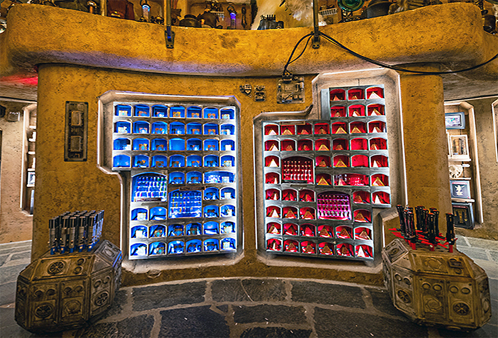 A maioria das pessoas compra no Star Wars Galaxy’s Edge, área temática dedicada ao mundo Star Wars dentro de alguns parques da Disney. Na Walt Disney World da Flórida, a área do Galaxy’s Edge fica dentro do parque Hollywood Studios, acessível via Toy Story Land ou pela Grand Avenue. Na Disneyland da Califórnia, é uma áreas de dentro do Disneyland Park, acessível pela Fantasyland ou pela Frontierland. Ambas oferecem as mesmas atrações, restaurantes e lojas, retratando o Black Spire Outpost no Planeta Batuu. Os fãs de Star Wars se referem às áreas, na California e na Flórida, respectivamente como: Batuu West e Batuu East. A loja mais importante do posto avançado é a "Dok-Ondar's Den of Antiquities" onde se pode comprar: roupas, lightsabers, "relíquias" diversas e os kyber crystals.
